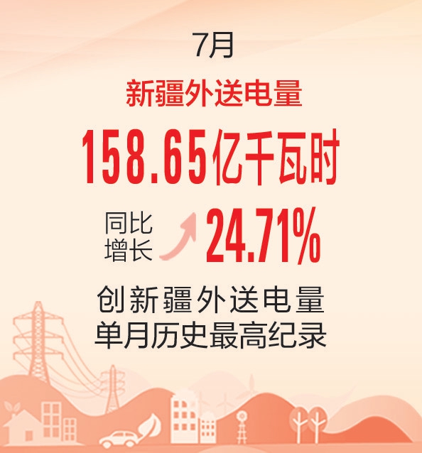 本报乌鲁木齐8月13日讯 石榴云/新疆日报记者陈蔷薇从国网新疆电力有限公司获悉:7月,新疆外送电量158.65亿千瓦时,同比增长24.71%,创新疆外送电量单月历史最高纪录。