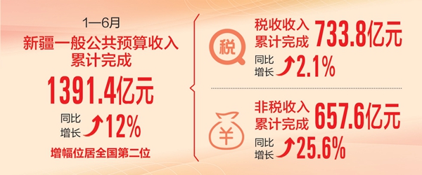 本报乌鲁木齐8月7日讯 石榴云/新疆日报记者冉虎从自治区财政厅获悉:1—6月,新疆一般公共预算收入累计完成1391.4亿元,同比增长12%,增幅位居全国第二位。全区14个地州市一般公共预算收入全部实现正增长。