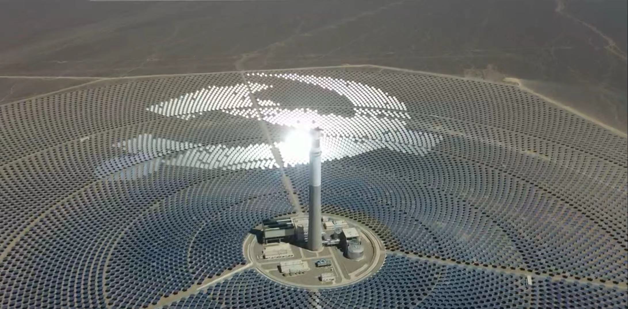 进入发电站,可以看到14500面五边形定日镜,每块48.5平方米,以同心圆的形式围绕着中心吸热塔,排列整齐,如同一个巨大的“银色向日葵”。这一片“向日葵”随太阳转动,将太阳光反射到吸热塔顶部的吸热器上,在吸热器上将聚积的太阳能转变为热能。