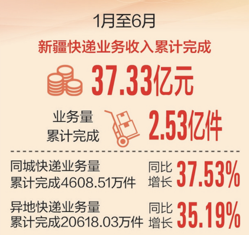 仅6月,新疆邮政行业业务收入完成10.18亿元,同比增长17.47%;寄递业务量完成8637.56万件,同比增长9.65%。其中,快递业务收入完成6.82亿元,同比增长13.37%;快递业务量完成4587.45万件,同比增长23.22%。