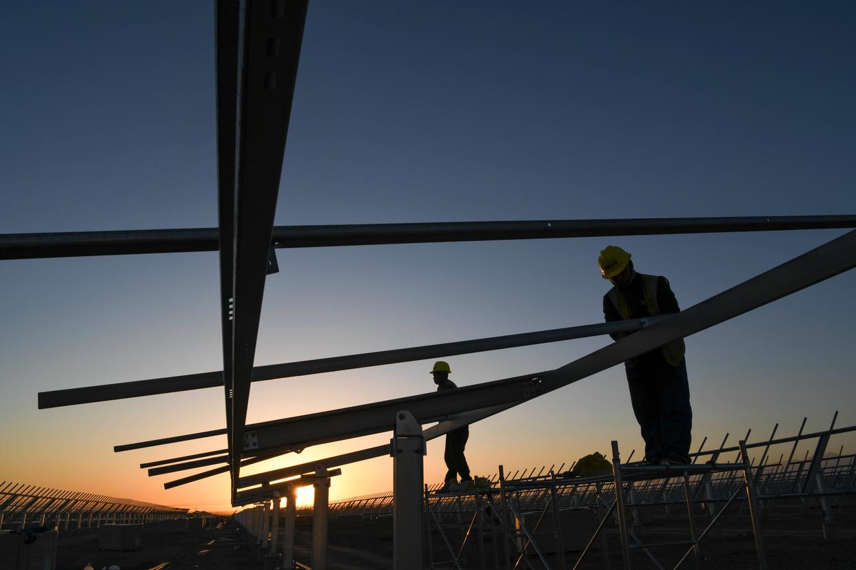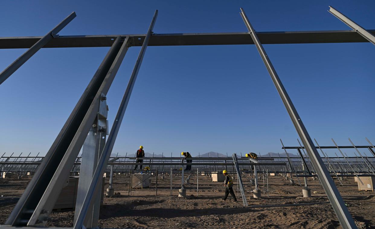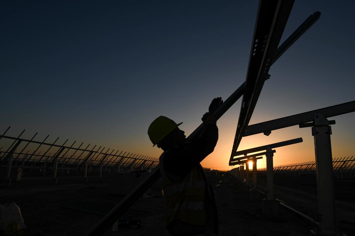 工人在新疆哈密市石城子光伏产业园内固定光伏板支架(9月9日摄)。新华社记者 胡虎虎 摄