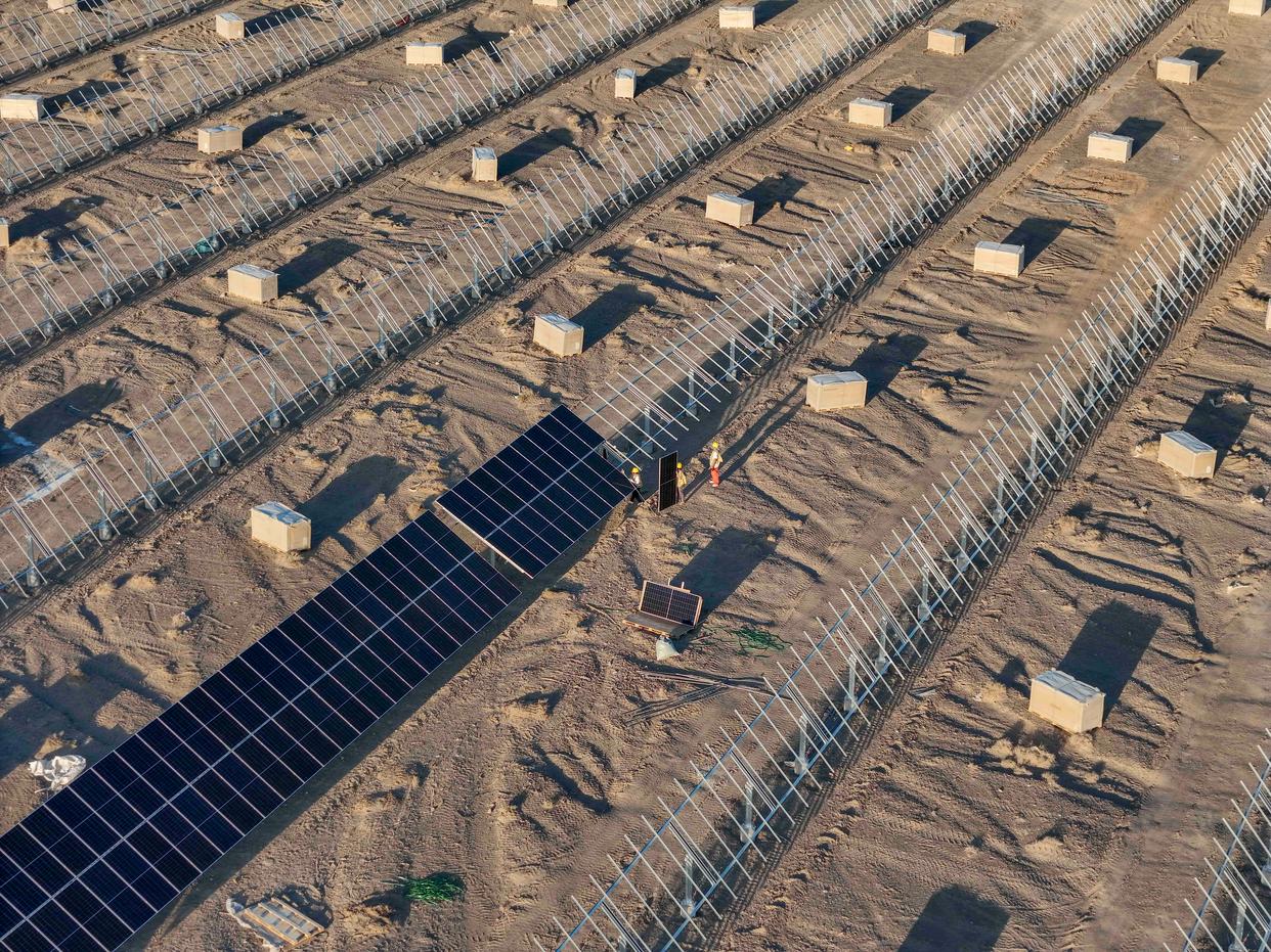 工人在新疆哈密市石城子光伏产业园内安装光伏板(9月9日摄,无人机照片)。新华社记者 胡虎虎 摄