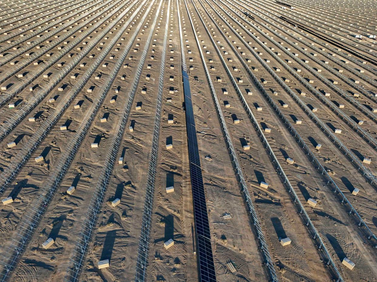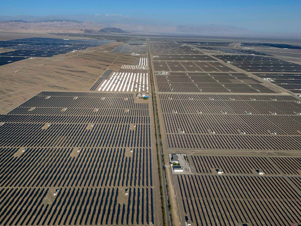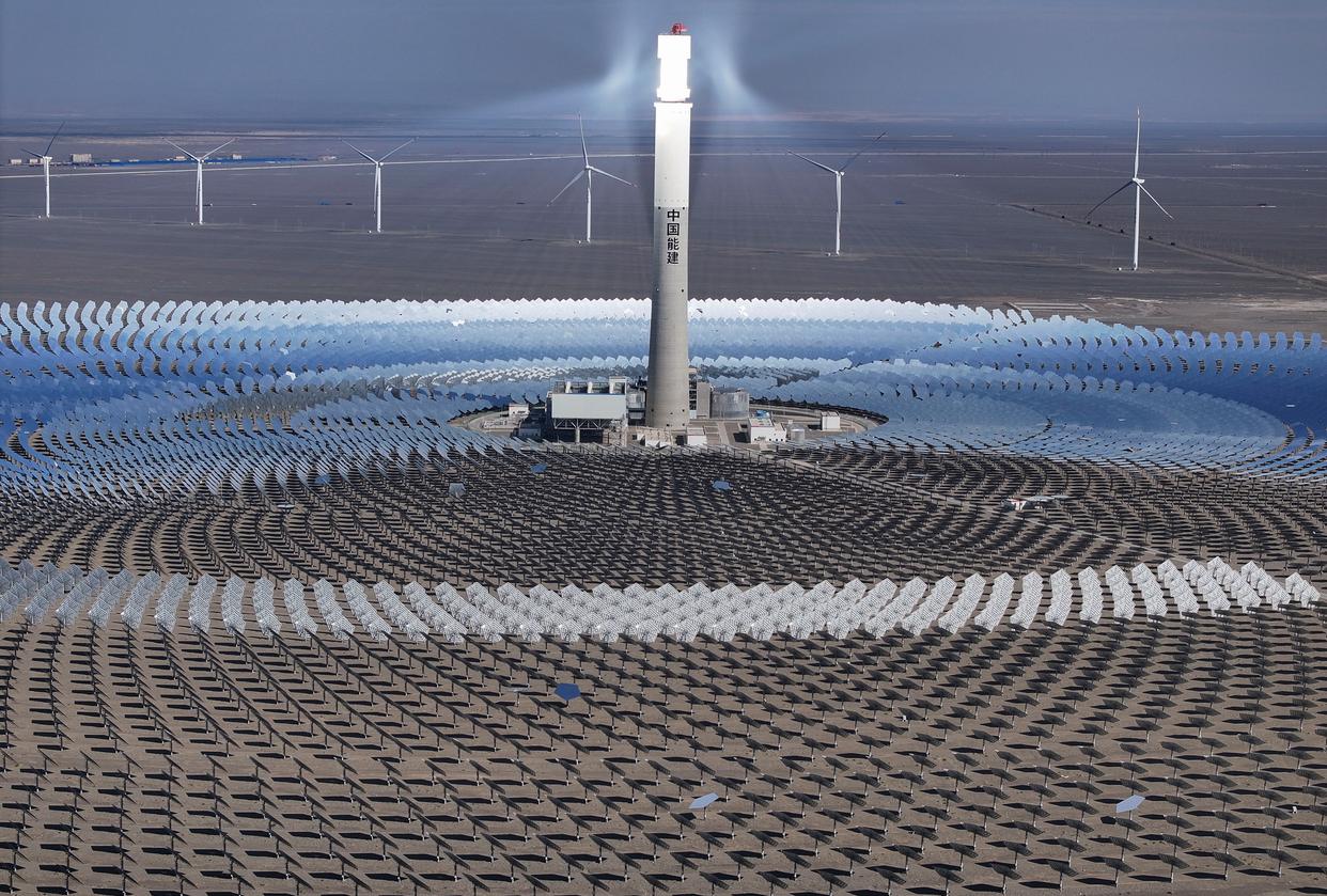 新疆哈密市石城子光伏产业园内一处在建的100万千瓦“光伏+光热”一体化清洁能源项目(9月9日摄,无人机照片)。新华社记者 胡虎虎 摄