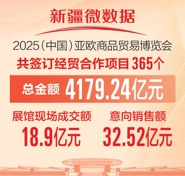 本报乌鲁木齐7月2日讯 石榴云/新疆日报记者黑宏伟从2日召开的2025(中国)亚欧商品贸易博览会成果新闻发布会上获悉:2025(中国)亚欧商品贸易博览会共签订经贸合作项目365个,总金额4179.24亿元;展馆现场成交额18.9亿元,意向销售额32.52亿元。