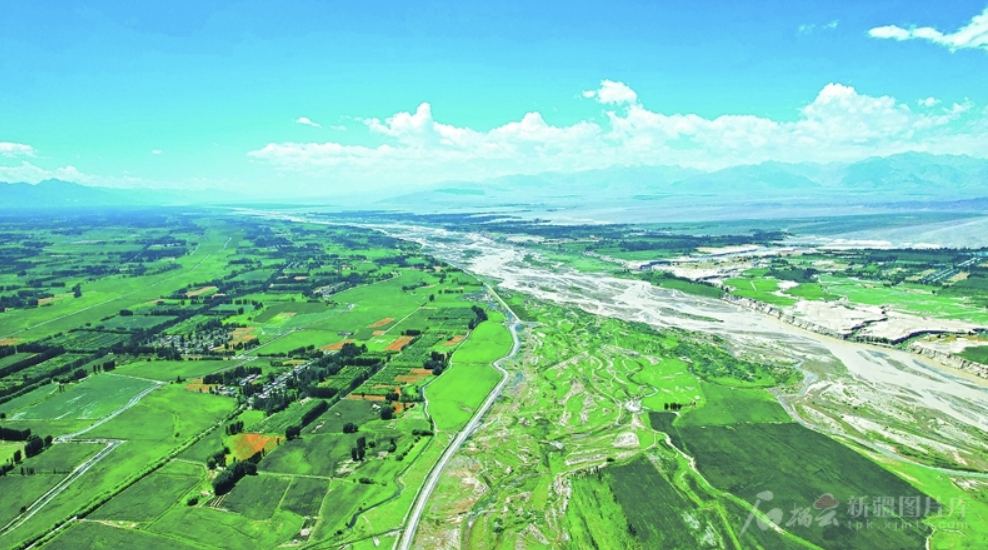 俯瞰乌什县托什干河国家湿地公园美景(6月23日无人机摄)。夏日的乌什县托什干河国家湿地公园,绿意葱茏、生机盎然。蜿蜒的河流、丰茂的湿地与两岸的田野、群山绘出一幅生态和谐的美丽画卷。 王举南摄