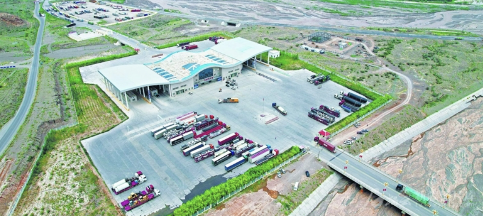 车辆在吐尔尕特口岸接受检查,等待通关(6月26日无人机摄)。截至目前,今年该口岸过货量已突破100万吨,同比增长69%,出入境人数突破10万人次。 石榴云/新疆日报记者邹懿摄