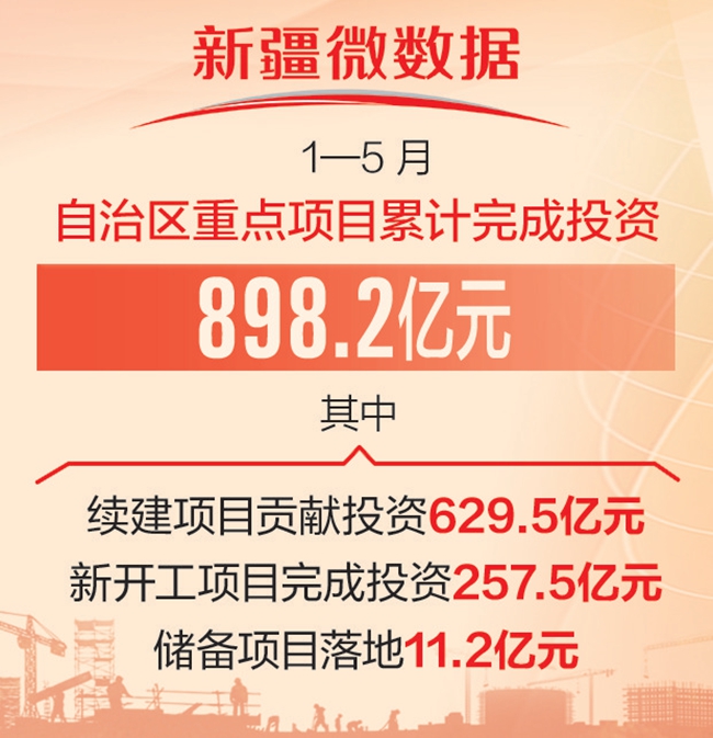 本报乌鲁木齐6月28日讯 石榴云/新疆日报记者石鑫从自治区发展改革委获悉:1—5月,自治区重点项目累计完成投资898.2亿元,重大项目建设持续提速。
