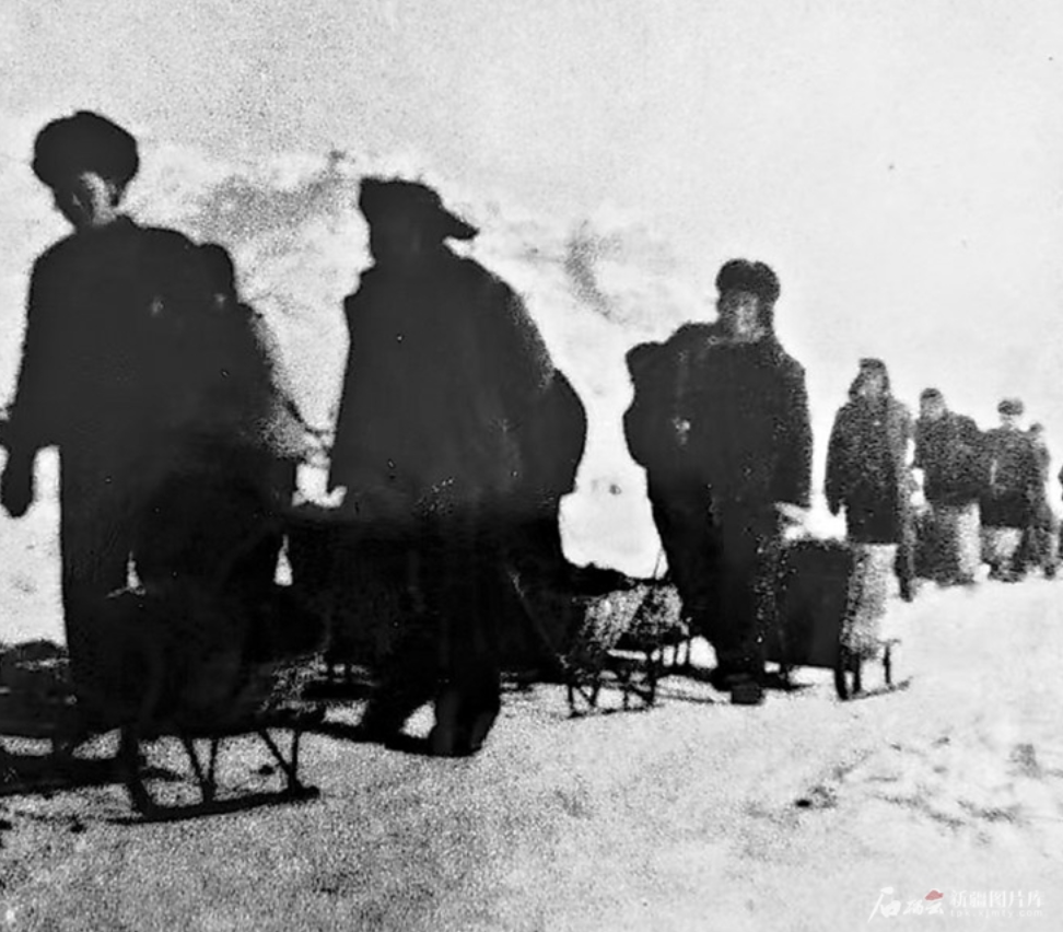20世纪50年代,矿工们隆冬时节拉运矿石。 巴哈提别克·加斯木汗供图