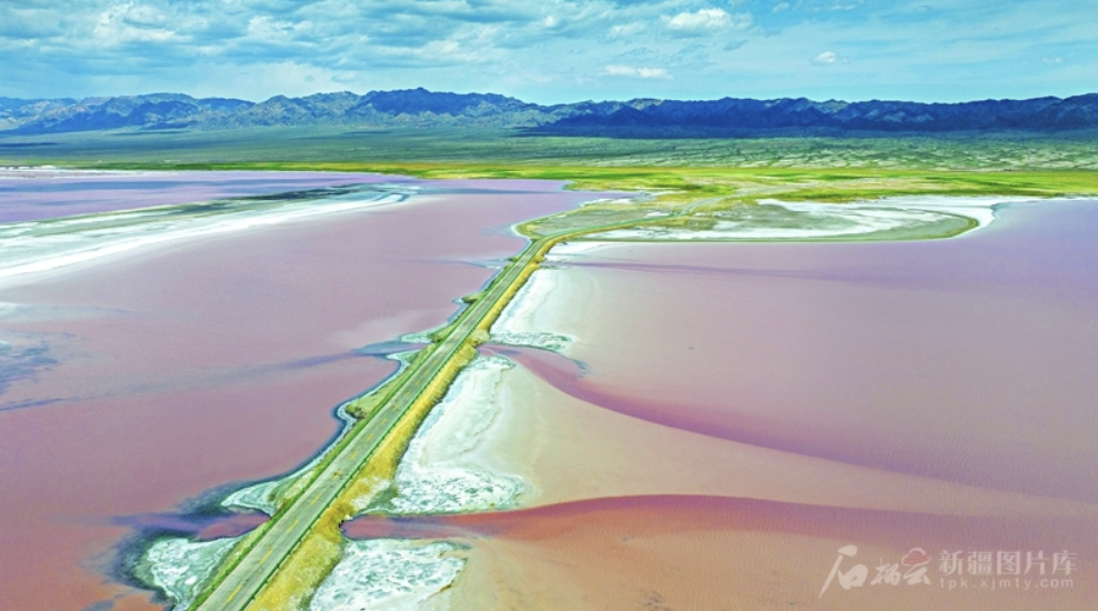 从空中俯瞰,伊吾县盐池镇幻彩湖宛如一颗镶嵌在草原上的明珠,泛着粼粼波光。微风拂过,远处喀尔里克冰川的轮廓在蓝天白云下若隐若现,近处湿地草原上成群的牛羊悠然踱步,一幅动人的生态画卷。