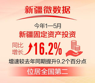 本报乌鲁木齐6月22日讯 石榴云/新疆日报记者石鑫报道:今年1—5月,新疆固定资产投资同比增长16.2%,增速较去年同期提升9.2个百分点,位居全国第二。这是新疆连续四个月投资增速保持全国领先地位。