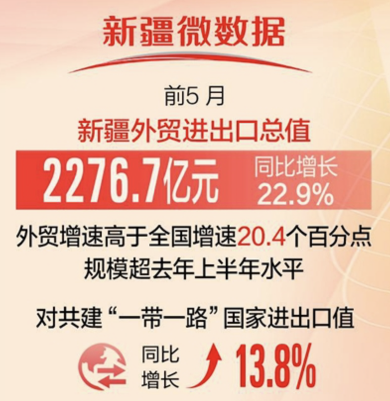 前5月,中国新疆与222个国家和地区发生贸易往来,对共建“一带一路”国家进出口值同比增长13.8%,占比84.8%。前两大贸易伙伴国仍然是哈萨克斯坦和吉尔吉斯斯坦。中国新疆对东盟、欧盟进出口值分别同比增长91.6%、55.7%。