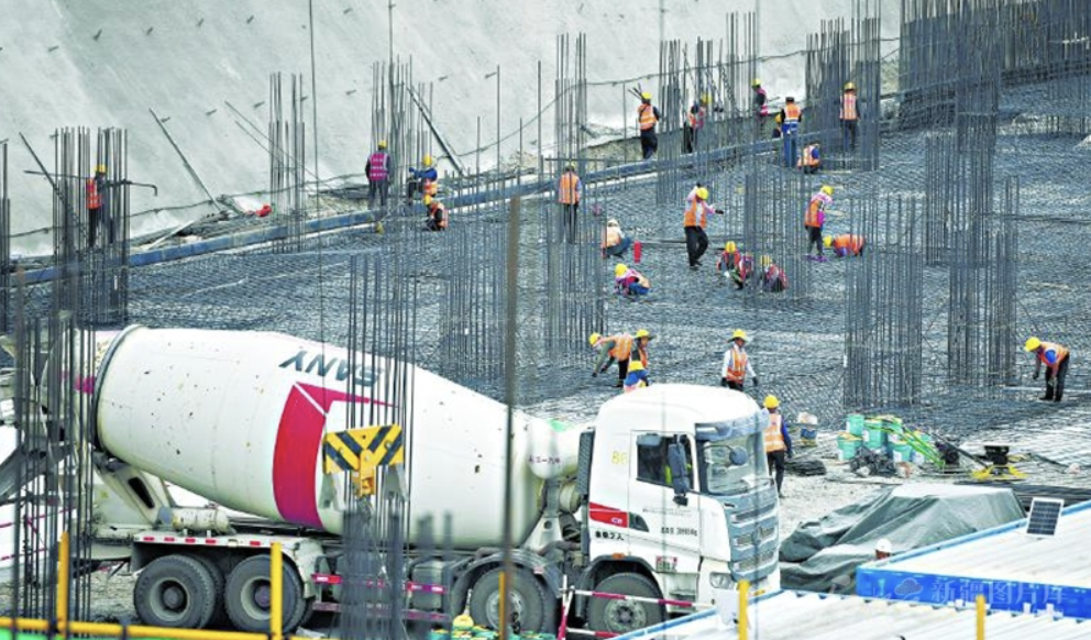 6月9日,工人在中国建筑第三工程局有限公司承建的国际路港物流服务园区CD地块项目现场施工。