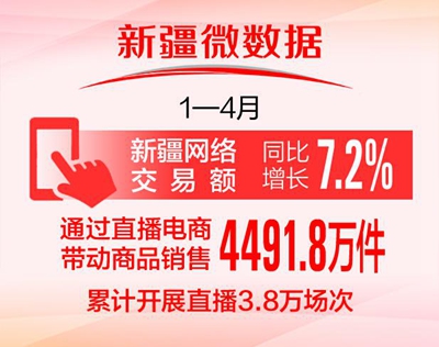 直播电商作为新兴增长极表现亮眼,前4月全疆通过直播电商带动4491.8万件商品销售,累计开展直播3.8万场次,食品保健类商品、珠宝配饰、美容护理成为直播销售最受欢迎的品类。