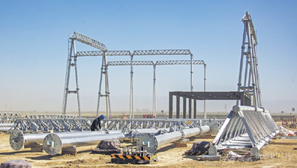 5月23日,工人在塔额750千伏输变电工程施工现场安装电力设施。