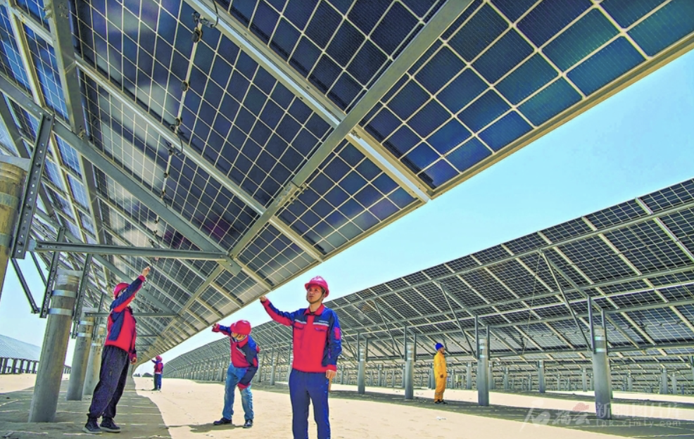 5月20日,工作人员在华润新能源50万千瓦光伏治沙暨产业园区低碳转型项目光伏发电站巡检。该项目于2024年6月在和田市吉亚乡团结新村开建,目前已实现并网发电。项目预计年均上网电量7.47亿千瓦时,可满足60万户家庭年用电需求。 石榴云/新疆日报记者约提克尔·尼加提摄