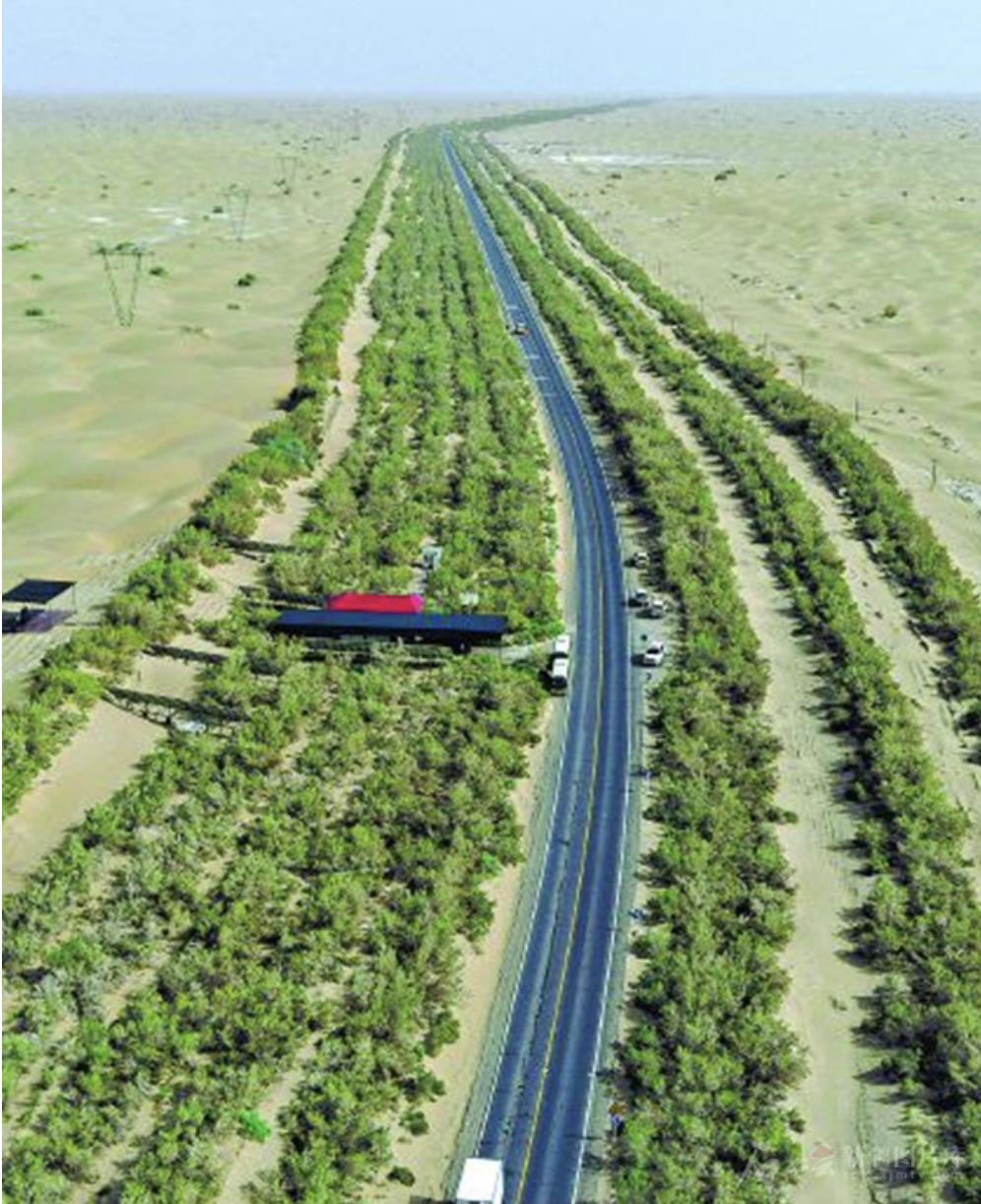 塔里木沙漠公路沿线绿树环绕(5月16日无人机摄)。当日,“大国工程看新疆”全媒体报道团队走进塔里木沙漠公路。该公路是我国首条零碳沙漠公路,两侧防护林带和100多座水井房形成3100公顷固沙屏障,使沿线流动沙丘固定率达95%以上。全线86座光伏电站年发电量362万千瓦时,每年可减碳3000吨。 石榴云/新疆日报记者李雄心摄