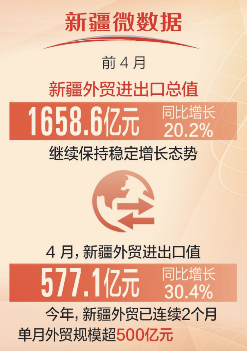 4月,新疆外贸进出口值577.1亿元,同比增长30.4%。今年,新疆外贸已连续2个月单月外贸规模超500亿元。