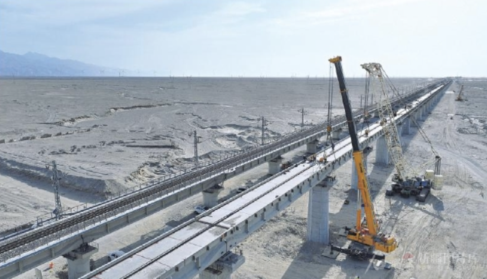 5月15日,工作人员在米兰河特大桥施工现场进行T梁架设。当日,罗布泊至若羌铁路全线最长桥——米兰河特大桥架梁任务全部完成,为铺轨施工奠定基础。 周江飞摄
