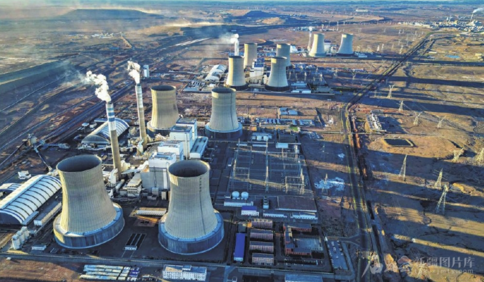 位于新疆准东经济技术开发区的昌吉—古泉±1100千伏特高压直流输电工程发电厂集群(5月7日无人机摄)。 石榴云/新疆日报记者蔡增乐摄