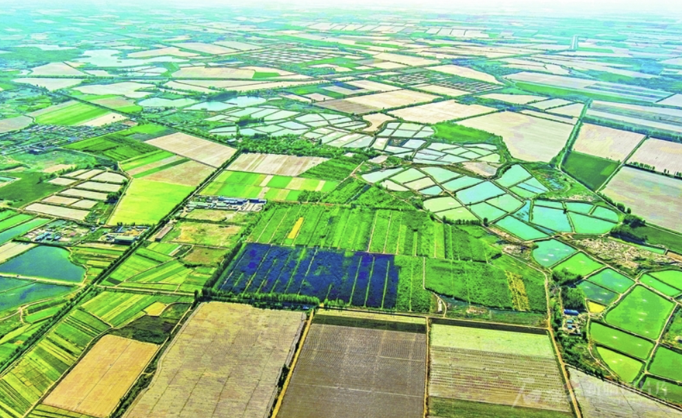 昌吉市六工镇十三户村的油菜花田和鱼塘(5月9日无人机摄)。 石榴云/新疆日报记者周鹏摄