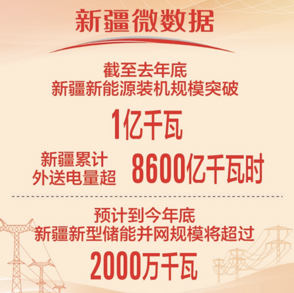 巩固好新能源产业领先地位,持续塑造新优势;持续推进以“沙戈荒”为重点的风光基地建设,系统谋划新增输电通道,进一步增强新能源外送消纳能力;加快高载能产业与新能源协同发展,大力实施风光火储一体化、源网荷储一体化项目,促进新能源高效利用、产业绿色低碳转型;推进智算中心集聚区建设,探索开展算电协同试点,打造全绿电、低电价园区,吸引算力企业在疆集聚,推动新能源就近消纳……