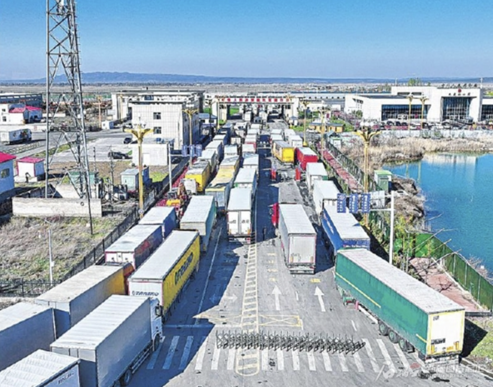4月17日,货运车辆在巴克图口岸排队出境。 常玉杰 摄