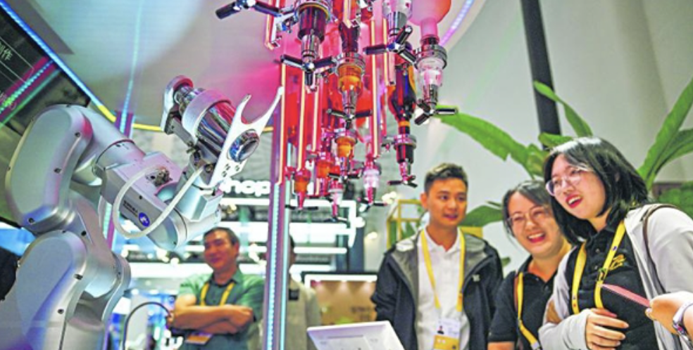 4月14日,消博会上展示的一款机器人在调酒。