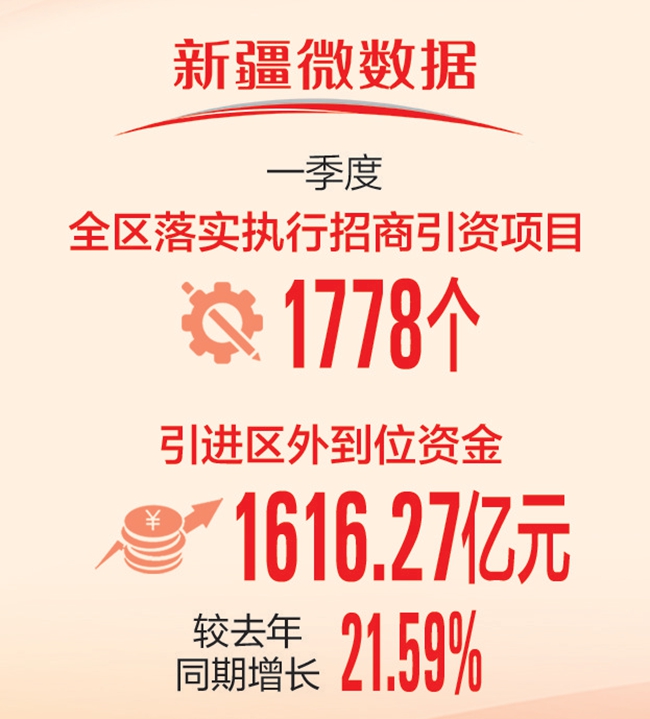 本报乌鲁木齐4月13日讯 石榴云/新疆日报记者黑宏伟从自治区商务厅获悉:一季度,新疆招商引资工作成效显著,全区落实执行招商引资项目1778个,引进区外到位资金1616.27亿元,较去年同期增长21.59%。