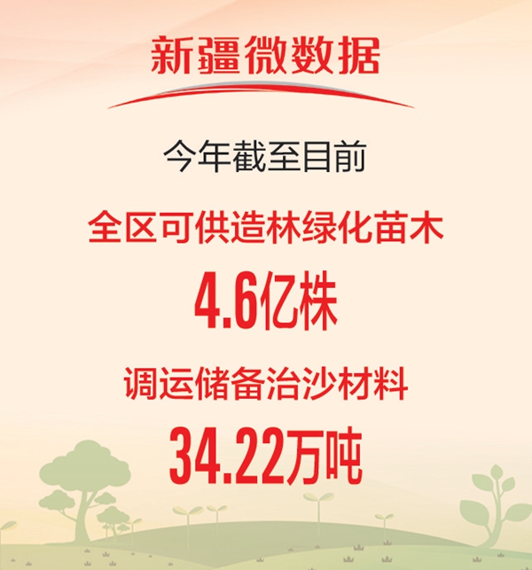 本报乌鲁木齐4月1日讯 石榴云/新疆日报记者曹华从自治区林业和草原局获悉:眼下正值春季植树造林黄金期,新疆各地加大种苗、治沙物资的保供力度。截至目前,全区可供造林绿化苗木达4.6亿株,调运储备治沙材料34.22万吨,市场供需总体平衡,能够满足绿化和工程固沙需求。
