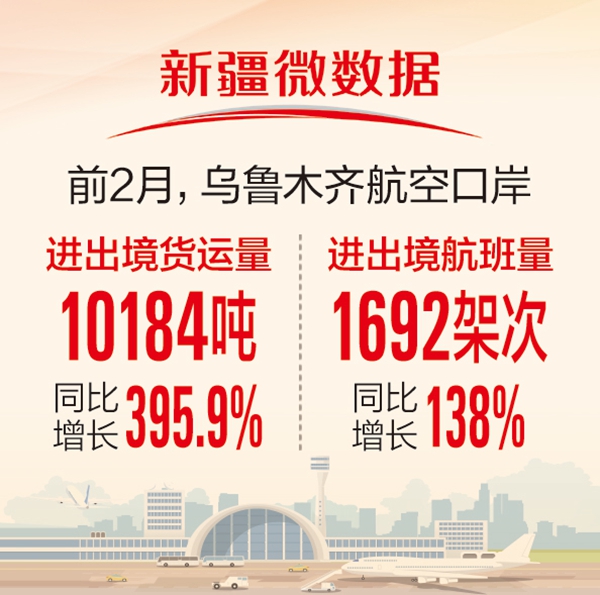 前2月,乌鲁木齐航空口岸出口货运量10108吨,同比增长401.3%;进口货运量76吨,同比增长102.5%,出口货运量表现尤为亮眼。