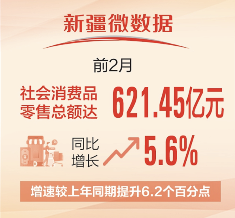 本报乌鲁木齐3月26日讯 石榴云/新疆日报记者黑宏伟从自治区商务厅获悉:1—2月,全疆消费市场活力持续释放,社会消费品零售总额达621.45亿元,同比增长5.6%,增速较上年同期提升6.2个百分点。