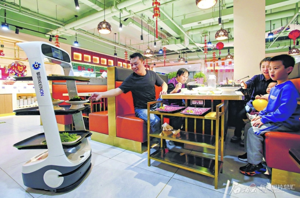3月17日,位于乌鲁木齐市水磨沟区温泉西路的一家火锅店,工作人员将菜品放在机器人的餐盘上,按下顾客所在桌号,机器人就将饭菜送达指定餐桌:“您的菜品已送达,请取餐。” 石榴云/新疆日报记者蔡增乐摄