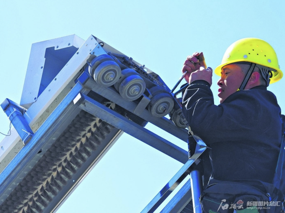 3月12日,在国家能源集团国神哈密煤电公司花园电厂,工作人员在光伏板上安装5G+智能光伏自动清扫机器人。该设备无需外接水源、电源,可以对光伏组件进行全天候、多频次清扫,显著提高了发电效率。 普拉提·尼亚孜摄
