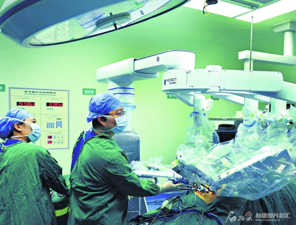 3月18日,在阿克苏地区第一人民医院手术室,医生操作微创机器人为患者做手术。 杨硕摄