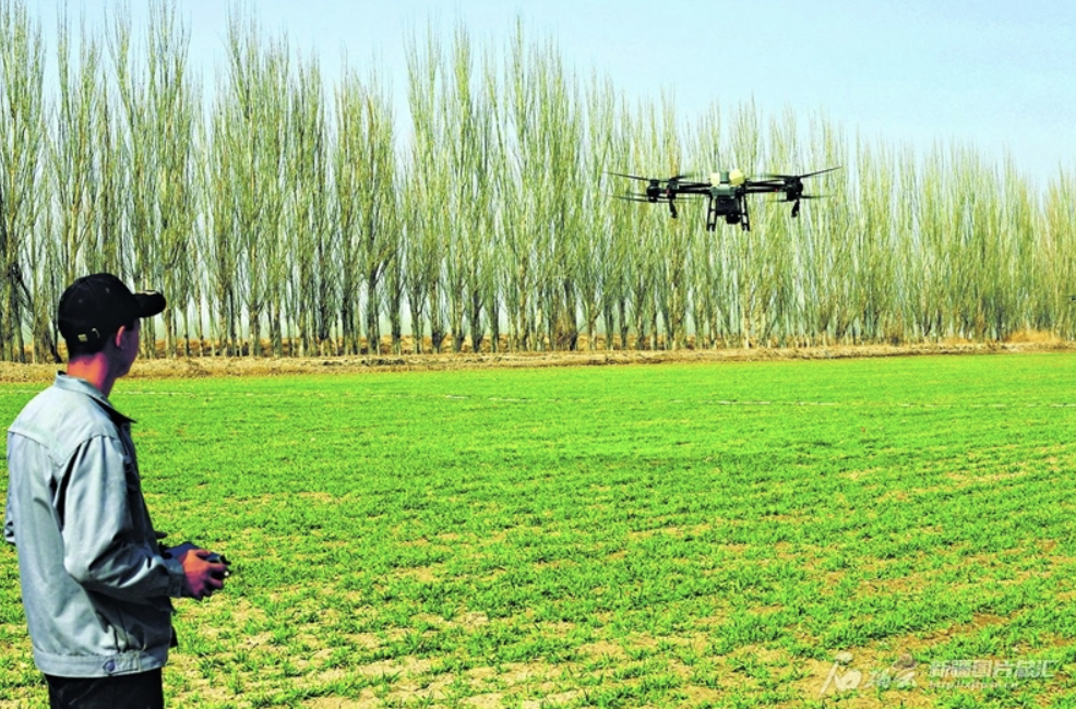 3月19日,在新疆生产建设兵团二师22团10连冬小麦地里,飞手操作植保无人机为冬小麦喷洒农药。眼下,该师种植的10.6万亩冬小麦长势良好,种植户抢抓农时为返青冬小麦追肥,确保今年粮食丰产增收。 谢江林摄