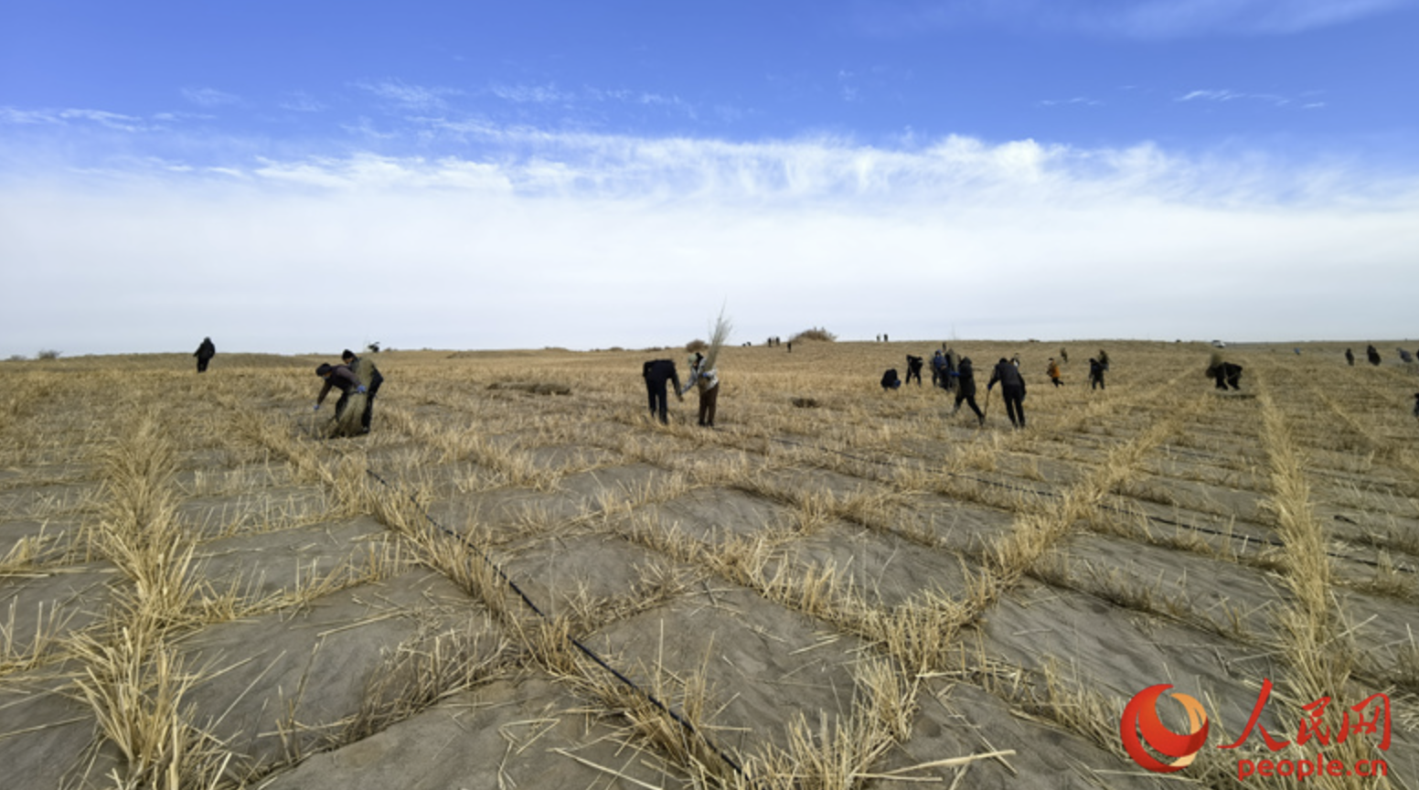 新疆民丰县后河坝沙漠阻击区,当地民众在草方格内种植沙枣树苗。人民网记者 陈新辉/摄