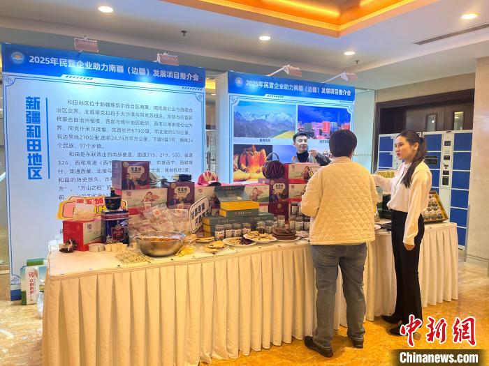 2月28日,2025年“民营企业助力南疆(边疆)发展”项目推介会在北京举行。图为新疆和田地区推介展台。 黄欣欣 摄