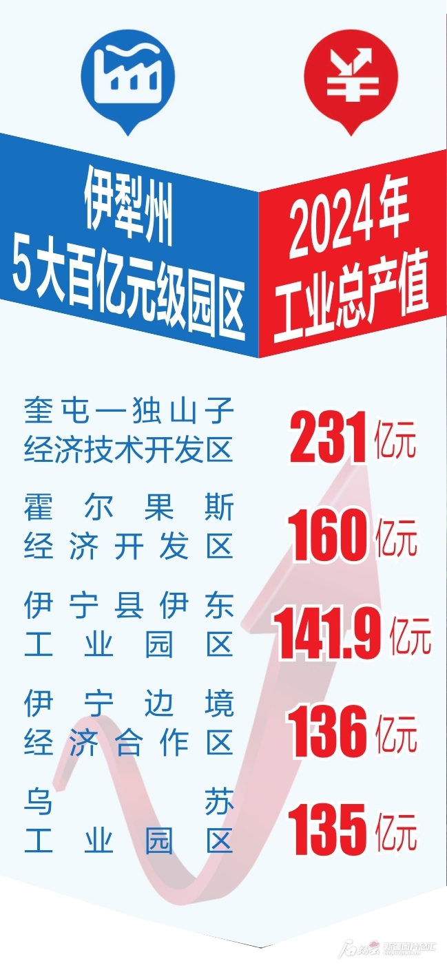 从依托石油石化产业的奎屯—独山子经济技术开发区(以下简称“奎—独经开区”)到开放创新的霍尔果斯经济开发区,从纵深发展的伊宁县伊东工业园区(以下简称“伊东工业园区”)到产城融合的伊宁边境经济合作区,再到蓬勃发展的乌苏工业园区,这5个园区都在发展道路上找准了各自的定位和方向,2024年分别交出了年工业总产值231亿元、160亿元、141.9亿元、136亿元、135亿元的成绩单。