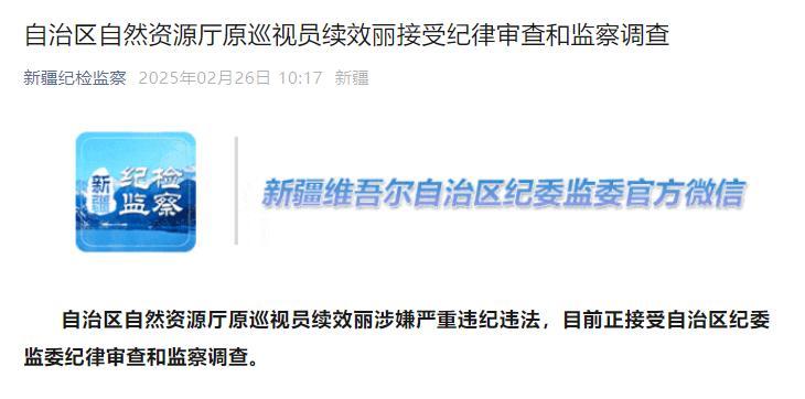 新疆维吾尔自治区自然资源厅原巡视员续效丽涉嫌严重违纪违法,目前正接受自治区纪委监委纪律审查和监察调查。