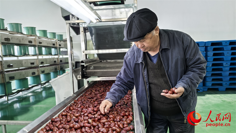 村里的红枣送到加工厂,分级、清洗、挑选、包装,图为李鹏查看红枣加工生产线。人民网记者 陈新辉摄