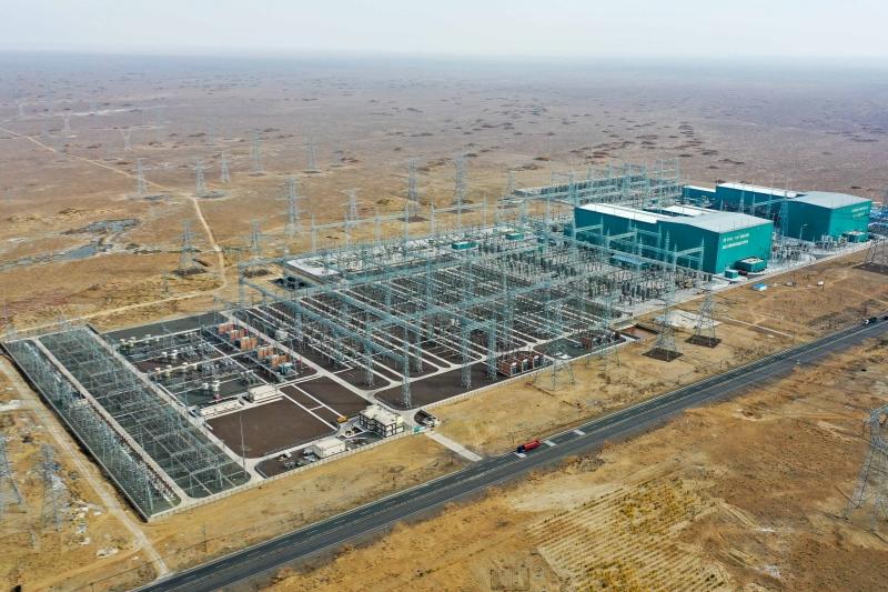 准东经济技术开发区的五彩湾戈壁滩,空中电线纵横交错。占地面积约415亩、大约相当于40个足球场大小的昌吉换流站里,3万多台设备昼夜运转,70多名运维人员24小时保障运检。几座风电场里,巨大风机排排矗立。