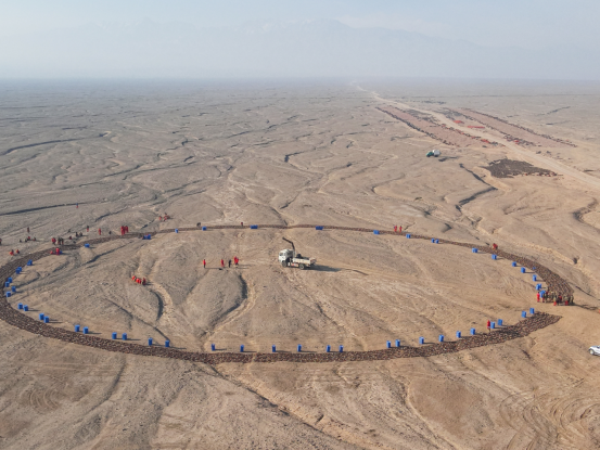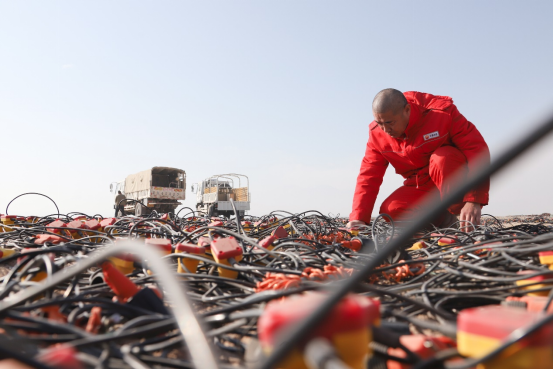 在施工现场,需要检测的无线节点仪器和检波器串摆成了一个巨大的圆形图案,李国忠和物探队员一起为这些仪器做“健康体检”。李国忠介绍,无线节点仪器稳定性高、便于携带,主要用在高难山体区。在沙漠区采用高精度可控震源,即保证了施工质量、提高了施工效率,也保护了生态环境,实现了绿色勘探。