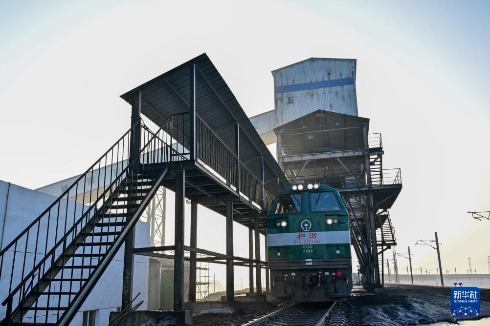 在国能新疆准东能源有限责任公司准东露天煤矿快装站,一列“百辆万吨”货运列车在装运煤炭(1月21日摄)。