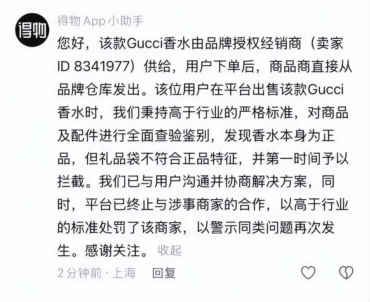 对此得物平台回应:该香水由品牌授权经销商销售,品牌仓库直发。用户再次出售时,平台二次查验确认香水为正品,但礼品包装细节不符正品特征,故拦截商品。已终止涉事商家合作并和用户协商,商品本身确为正品。