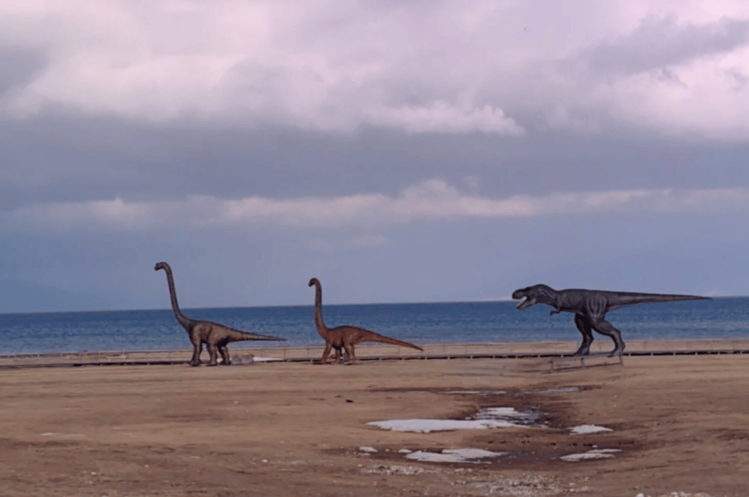 当时,不少游客在社交平台分享了图片。雪山、冰湖、恐龙同框,有网友表示“末日感拉满”“回到了侏罗纪时代”……