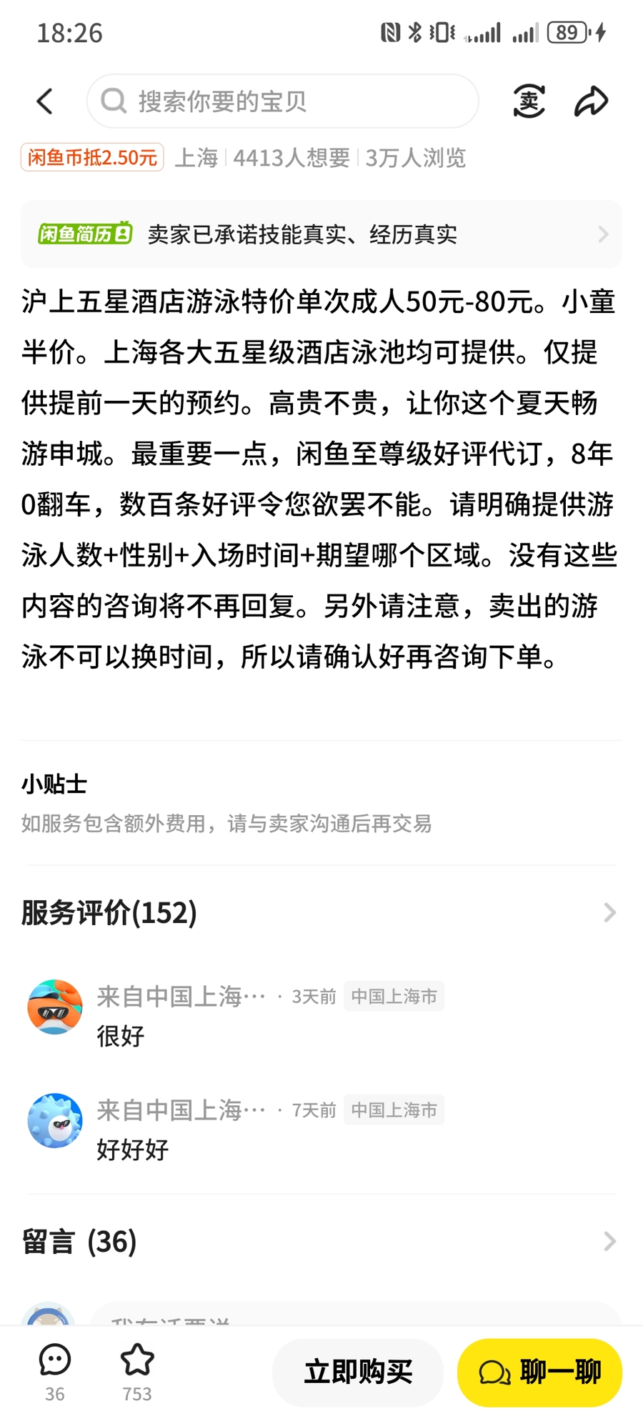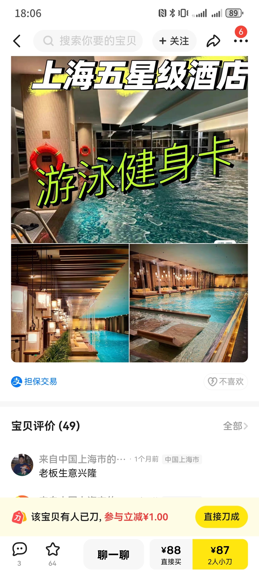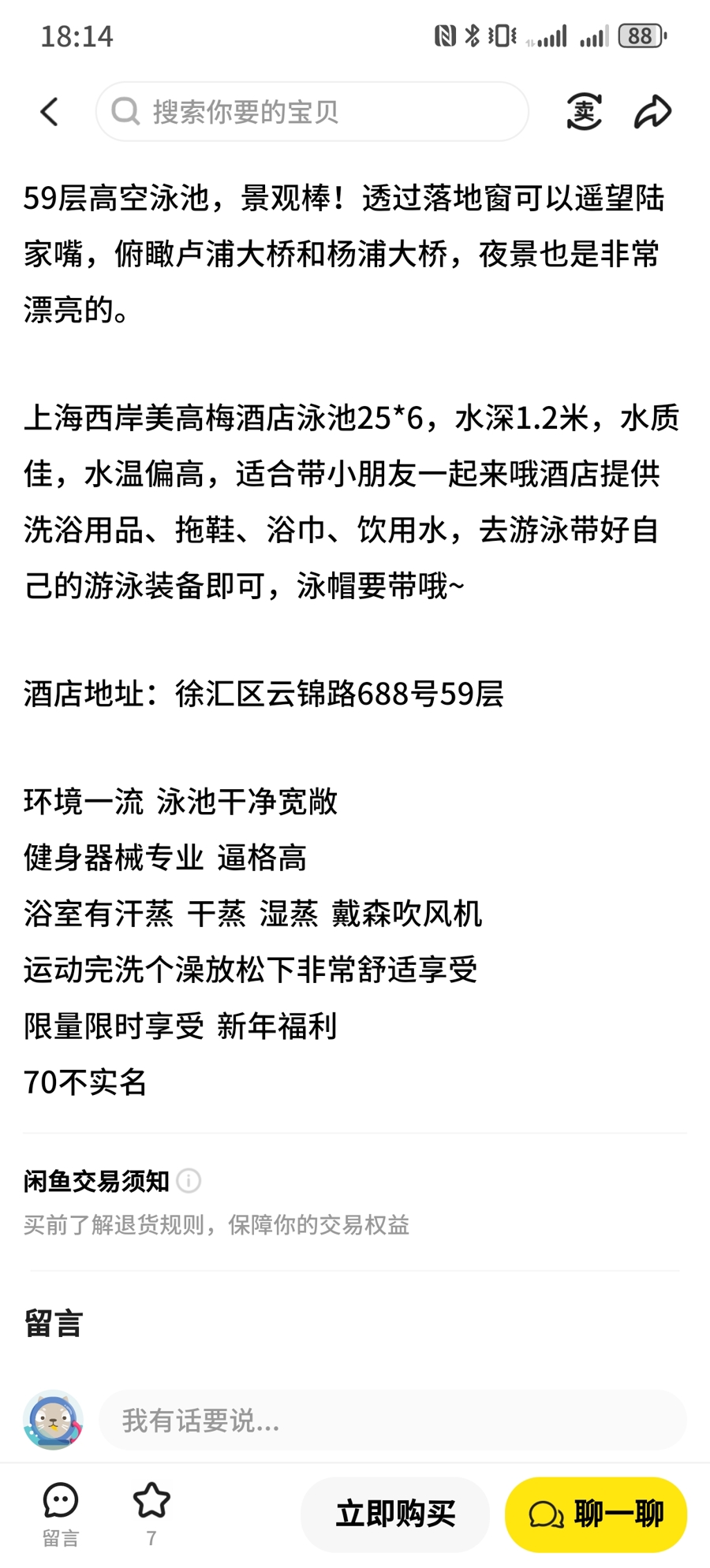 据市民李先生称,他通过闲鱼购买徐汇滨江一家高档酒店的游泳券时,并未注意到商品内文注明有“非实名”字样。抵达酒店后,他先是报上了自己的名字,工作人员在电脑上查找一番后回复称“查不到”。他当即联系卖家,卖家一边责怪他在抵达酒店前没有提前联系,一边紧急发来了“5210”房号和“周某”的人名。由于当时已近下午3时,李先生报上周某信息后,前台查询后则称“周某已退房”。尽管闲鱼卖家此后又提供了周某的身份证后四位“4397”,但李先生最终仍未能入场游泳……