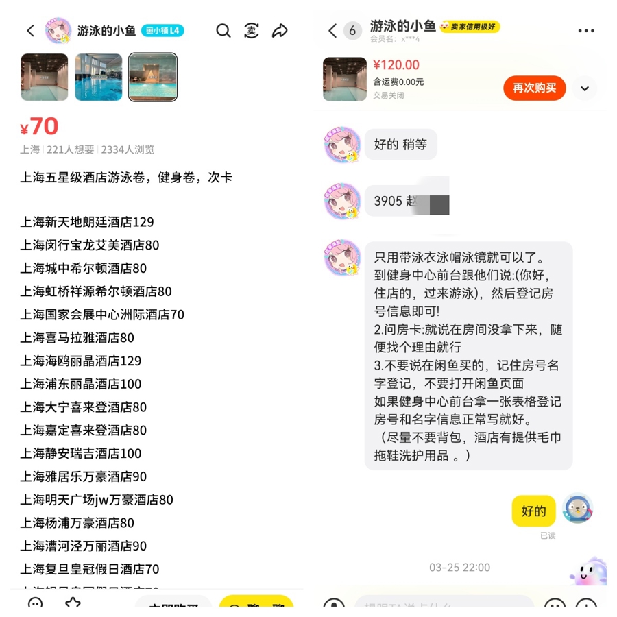 在“闲鱼”平台购买了上海一家高档星级酒店的游泳健身券后,有市民并未收到预订成功的信息,或者常见的用于核销消费券的二维码,反而收到了一个房间号和人名。按照卖家的说法,报上房间号和人名,就能入内游泳健身,不会有人阻拦。