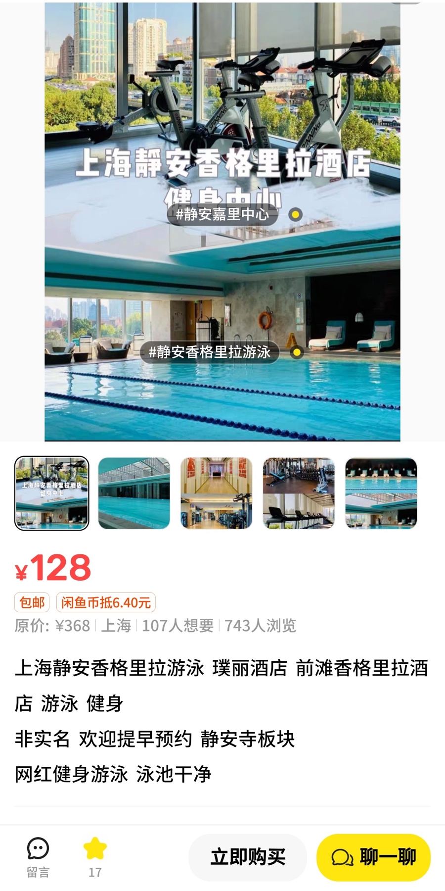 记者在闲鱼平台看到,李先生购买游泳券的闲鱼店打着“靠谱代订”的标签,同时在售17款“游泳健身”类商品,都是各大星级酒店游泳健身中心的代订业务。如静安香格里拉酒店健身中心的预订标价为128元,商品内文注明有“非实名”字样。