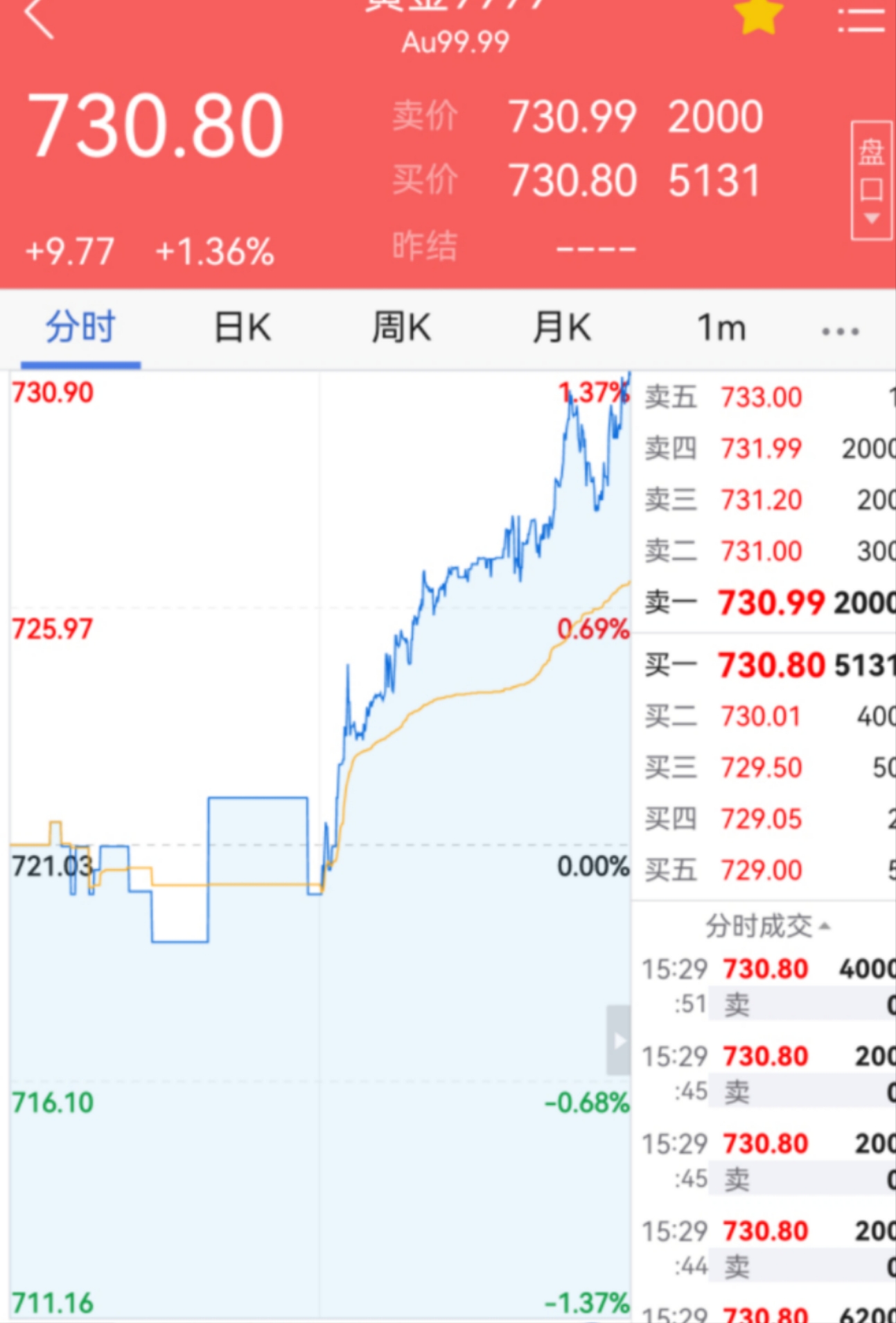 受国际金价影响,3月31日上海黄金交易所的黄金9999品种也随之上涨至730.8元/克,全天上涨1.36%(下图)。
