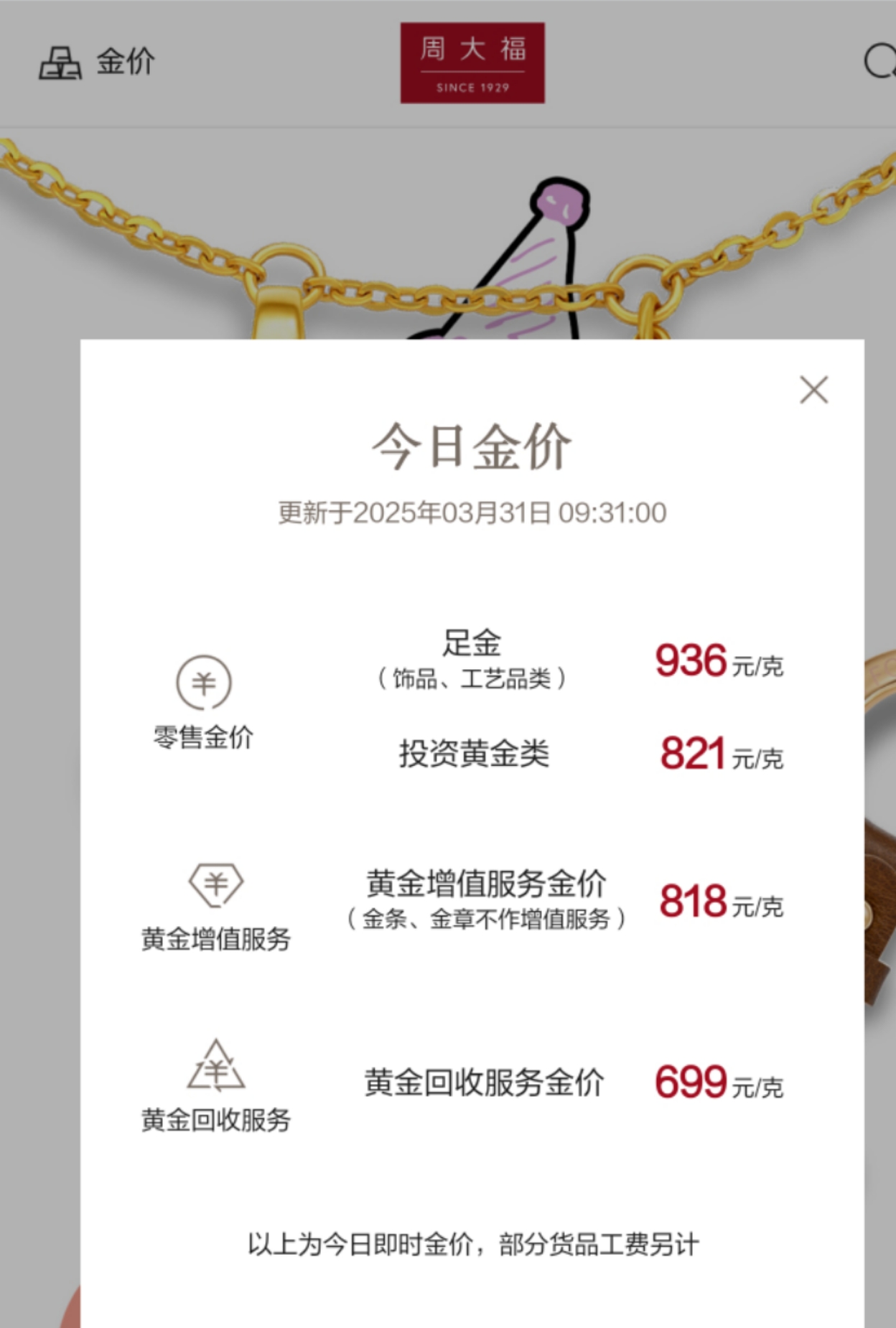 红星新闻记者在市场中了解到,伴随金价上涨,黄金饰品价格也进一步冲高。其中周大福金店饰品价格已调整至936元/克(下图)。六福金店饰品价格也调整至934元/克,首饰金价格已接近千元心理线。